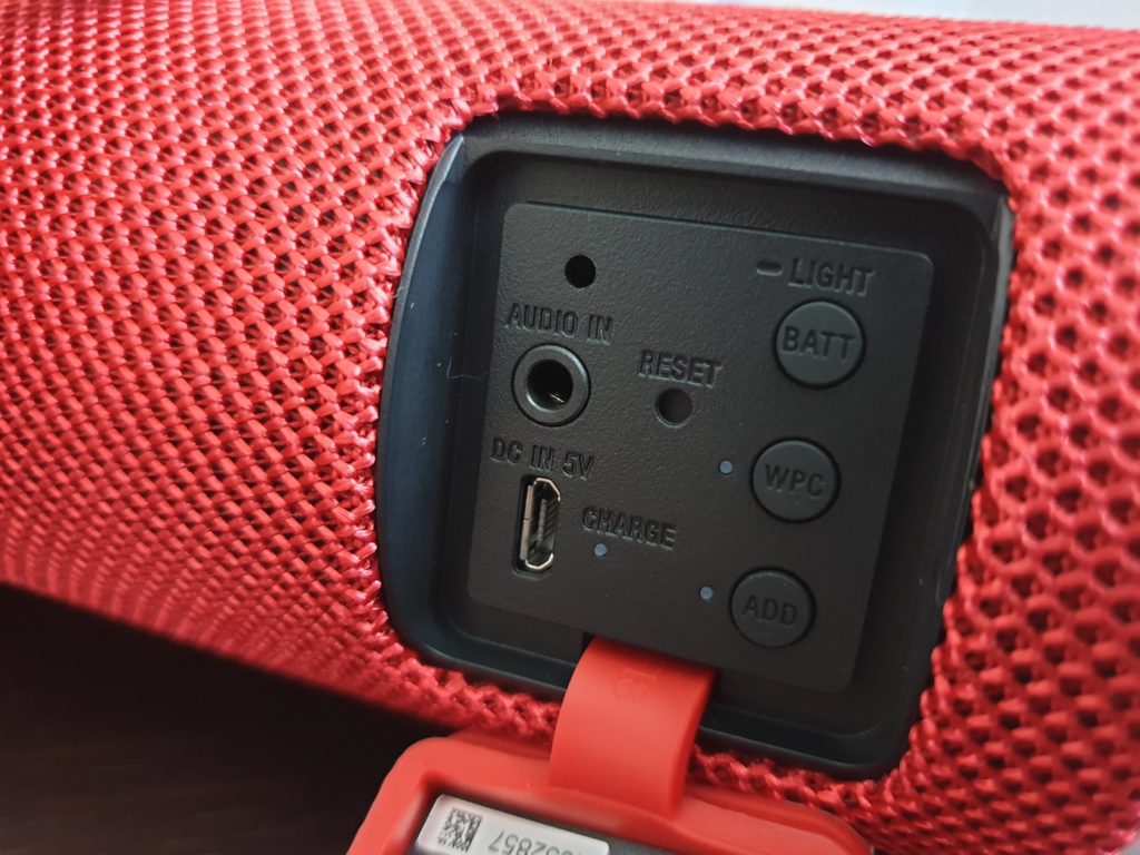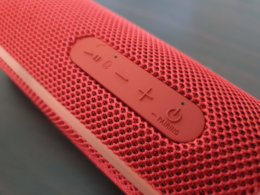 În partea de sus a boxei găsim un sticker NFC pentru conectare directă, fără a mai căuta pe bluetooth. În partea opusă găsim patru butoane de control: